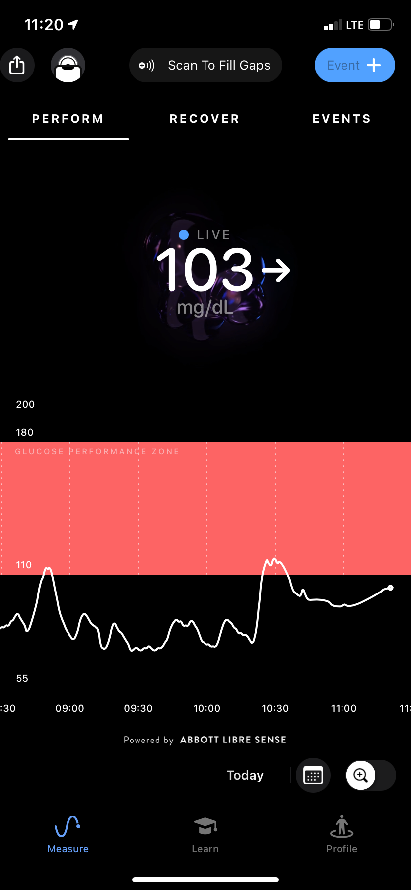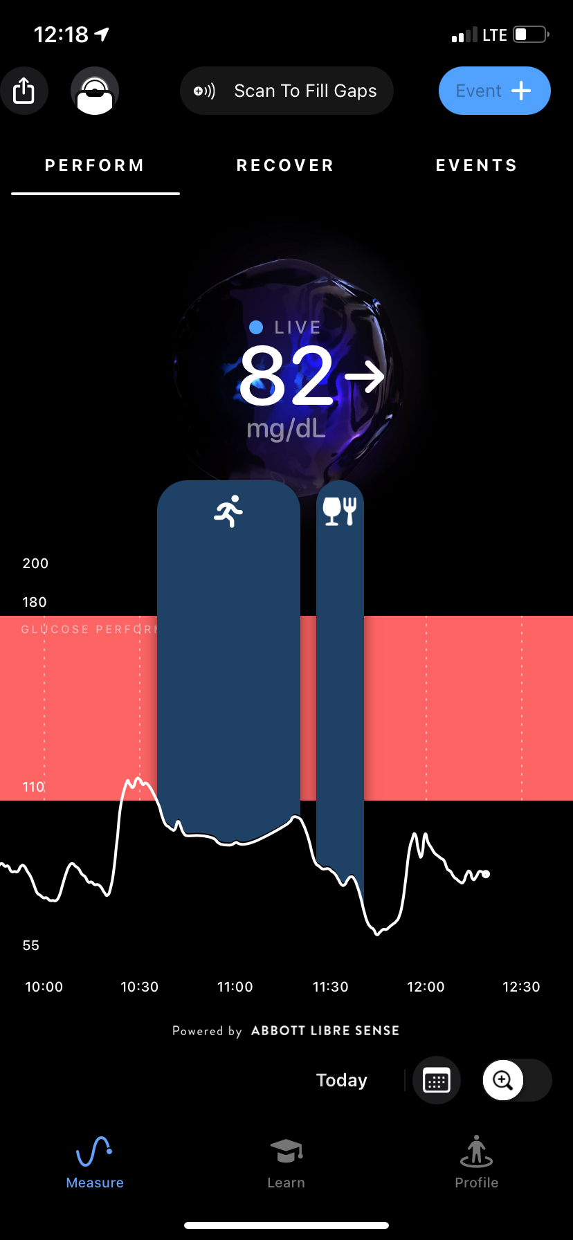 Finding out what sends you skyrocketing and crashing often comes down to trial and error in the first few weeks. Cereal isn’t great for me as a stand alone but when you add in fresh or dried fruit that changes the”ramp” or rate of increase. If I have cereal alongside a source of fat or protein - things change dramatically. So eggs with a side of cereal and fresh fruit create a longer, slower ramp. Fueling for a race ro workout looks different than a regular run. I only feel that I’ve nailed it once in 10 days. I have tried eating nothing before a run and going out. I’ve tried preloading with a gel and going out. I’ve tried taking 2 chews before a run and then 1 chew every mile for a run. Each produced different results, none of them produced a high score and often gave me significant lows in my glucose. Don’t get me wrong - these runs all felt good but not, “wow, this is it!”. Each fueling strategy gave me insights of what works and what doesn’t; it’s not all error but initially it can feel like it.