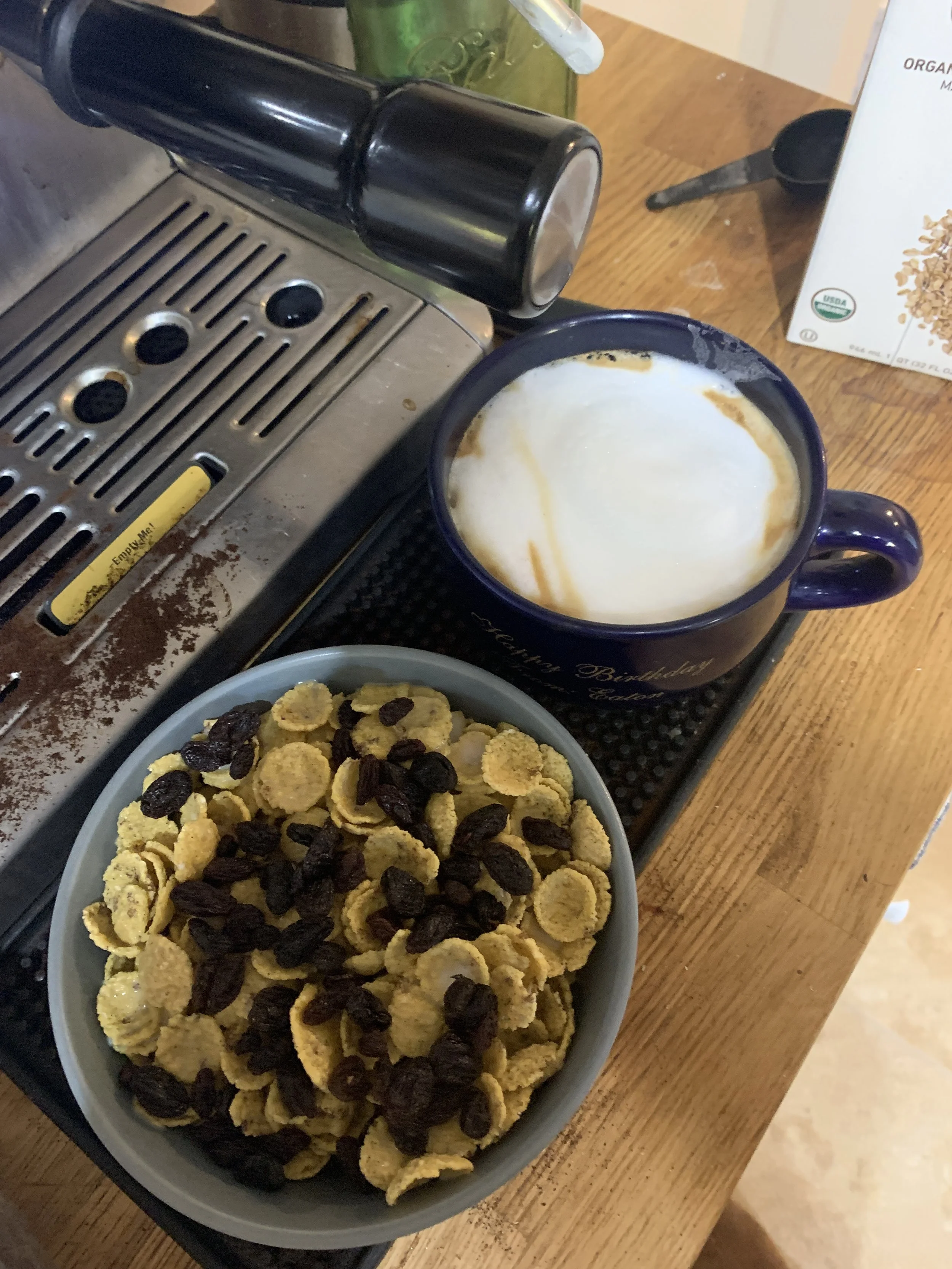 A latte and cereal with dried fruit. Not balanced enough for long term fueling. I needed to add a greater protein and fat component for this to be successful at fueling my morning run / feeling full for the morning. I didn’t run until 3 hours later and I was starving.